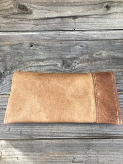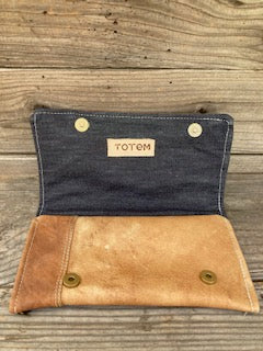 11″ x 5″ snap clutch made from vintage cowboy chaps with sterling silver and turquoise